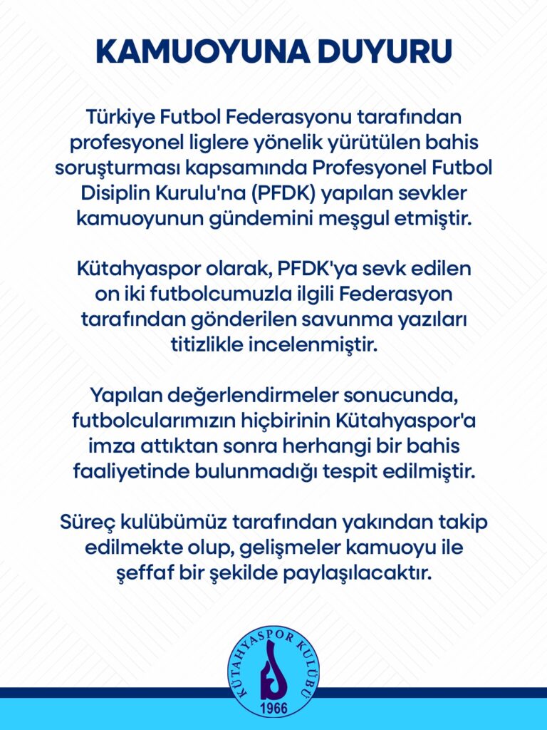 Açıklamanın devamında; “Yapılan değerlendirmeler sonucunda, futbolcularımızın hiçbirinin Kütahyasppor’a imza attıktan sonra herhangi bir bahis faaliyetinde bulunmadığı tespit edilmiştir” denildi.