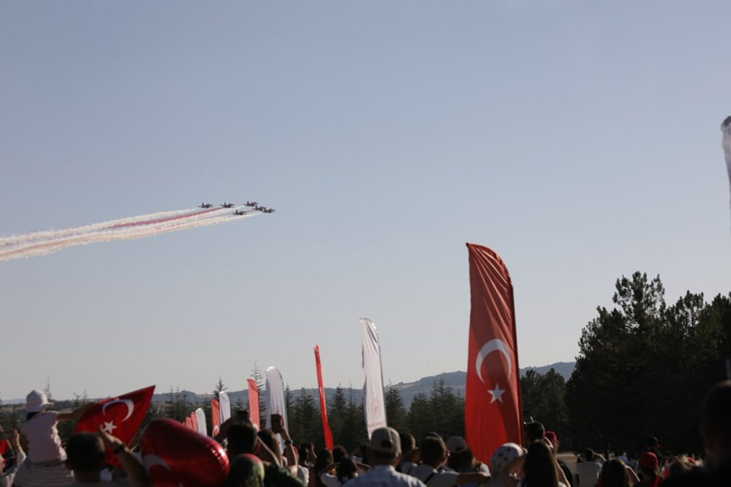 Zafertepe Çalköy’de gerçekleştirilen programda binlerce vatandaş, ellerinde Türk bayraklarıyla gökyüzünü izledi. Türk Yıldızları, kırmızı-beyaz dumanlar eşliğinde yaptıkları senkronize uçuşlarla alanda büyük coşku oluşturdu. Katılımcılar, tarihi günün gururunu yaşarken, gökyüzünde süzülen uçaklar milli birlik ve beraberliğin simgesi oldu.